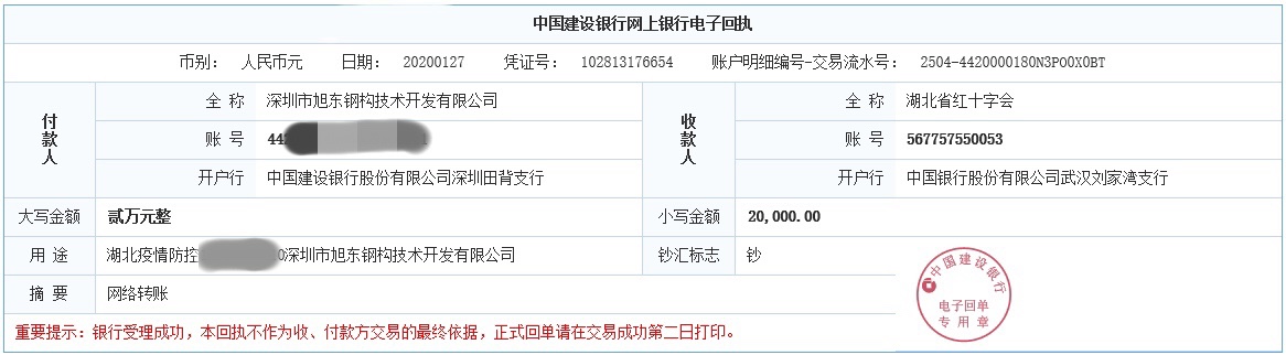 深圳市旭東鋼構技術開發(fā)有限公司也毫不猶豫,主動承擔社會責任,奉獻出自己的一份力量,2020年1月27日向湖北省紅十字會捐贈兩萬人民幣,展現(xiàn)了公司的社會責任感和企業(yè)的一份愛心。
