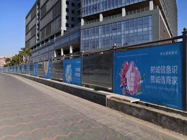 在工地上安裝好了施工圍擋后,禁止利用施工現場圍擋設置戶外廣告。施工現場未按規定圍擋的,由市、區城市管理執法部門依法處罰;市、區建委責令限期改正,停業整頓;逾期不改正的,移交市、區城市管理執法部門處理。圍擋不得用于擋土和承重,不得依靠圍擋堆放材料,不得利用圍擋作為墻面搭設臨施工棚、食堂、廁所等,施工現場圍擋的設置和管理由總包負責。未施工的,由業主負責。圍擋管理單位應做好圍擋的維護和清潔工作,保持圍擋的清潔,不得有任何張貼、涂鴉或描繪。圍護基腳采用M10水泥砂漿和MU10頁巖磚砌成,用于提高圍護結構的抗風穩定性。美化工地施工圍擋,噴涂企業名稱、安全、質量、文明施工用語,并制作開發項目的商業廣告。禁止張貼、書寫垃圾廣告。